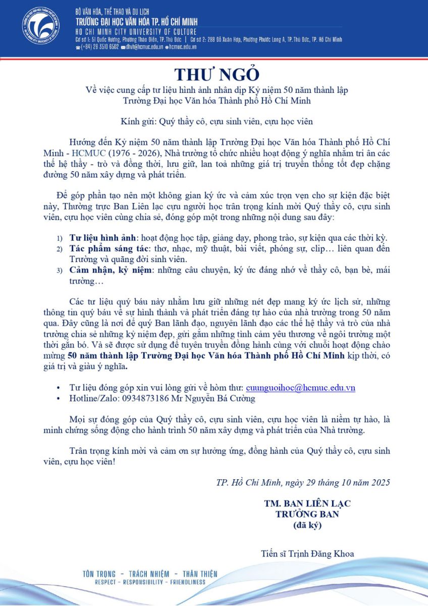 Bạn đang đọc bài viết trên Cổng thông tin điện tử của Ban Liên lạc Cựu người học Trường Đại học Văn hóa thành phố Hồ Chí Minh. Mọi thông tin góp ý và chia sẻ với Ban Liên lạc Cựu người học trường xin vui lòng gửi về hòm thư cuunguoihoc@hcmuc.edu.vn